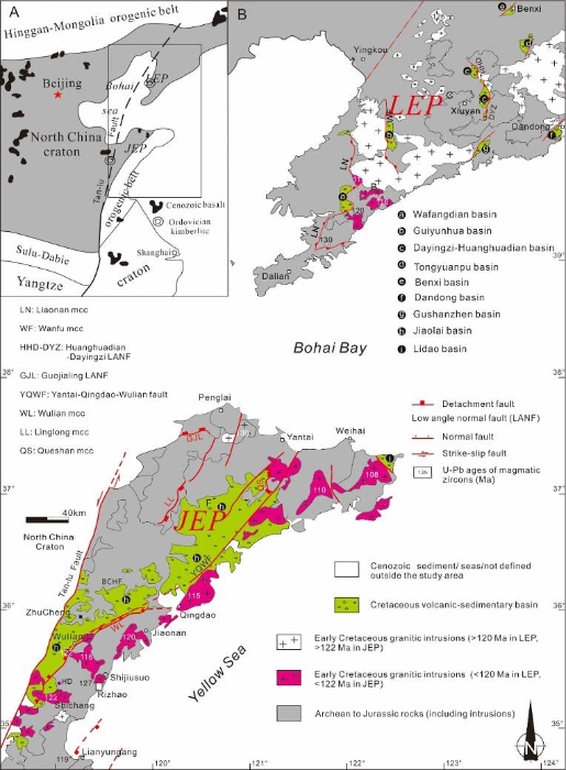 图1 胶东-辽东伸展构造省构造简图,注意胶东地区大型断陷盆地与< 122Ma花岗岩与火山岩大规模发育、辽东地区遍布式断陷盆地群及大于120 Ma的大规模花岗岩