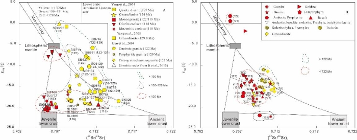 3. 胶东、辽东伸展构造省早白垩世岩浆源区具有显著差异的源区及变化规律。辽东伸展省的岩浆活动来源于古老下地壳、富集地幔物质加入以及年轻的新生下地壳,从早到晚具有显著的源区演化趋势。而胶东伸展省的岩浆则来源于多样的、混染的岩浆源区,且在122 Ma有强烈的幔源源区岩浆活动(图4)。