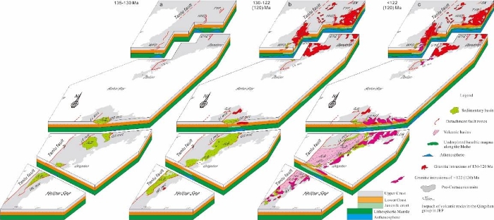 4. 被动裂谷作用主导华北克拉通乃至东亚早白垩世岩石圈伸展,岩石圈壳-幔拆离(Parallel Extension Tectonics)造成华北克拉通岩石圈减薄与破坏(图5)。开始于135 Ma的克拉通拆离断层作用在地壳和岩石圈地幔都很普遍。在具有较弱岩石圈的辽东伸展构造省,宽裂谷作用导致地壳独自拆离,被塑性伸展拆离的岩石圈地幔可能导致软流圈上涌和壳幔边界玄武质岩浆的底辟上涌,形成一个构造-岩浆带。胶东高强度的冷岩石圈在早期中上地壳出现局部拆离断层作用,晚期发生深部的垮塌诱发大规模岩浆活动。