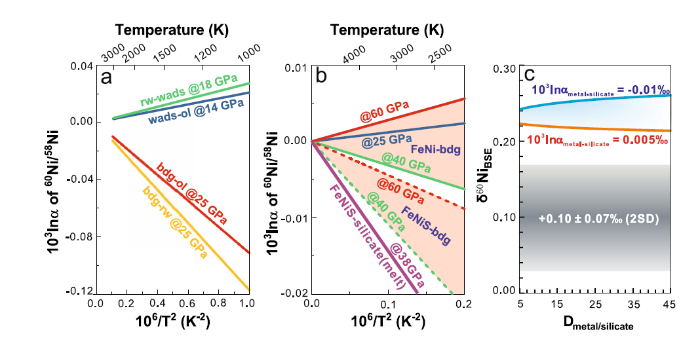 图2 第一性原理计算不同含Ni矿物间Ni同位素分馏因子(a和b)以及理论计算核幔分异可能产生的Ni同位素分馏(c)