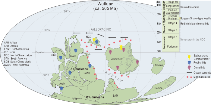 突出显示华北在寒武纪中–晚期东、西方两大生物地理区的生物交流中, 担当了重要的桥梁纽带作用