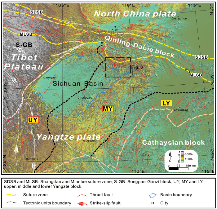 关于华北板块与华南板块的时空结构和演化历史是地质研究的热点问题,随着秦岭古特提斯分支洋盆在三叠纪的闭合,华北和华南板块完成了最终的碰撞拼贴,而洋壳闭合后造山活动及其过程仍存在一定争议。在川东与大巴山交汇区发育的系列褶皱冲断带,是在华北板块和华南板块碰撞后形成的陆内弧形构造带(图1),研究该区构造变形特征、年代学分析及运动学过程能为揭示华南-华北后造山过程提供重要依据。