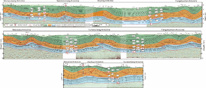 (1)川东北和大巴山交汇区整体呈复向斜的构造样式,研究区发育的三套区域性滑脱层(下寒武统泥页岩、志留系泥页岩以及下三叠统膏盐岩),将该区地层划分为基底、深部、中部和浅部四个构造层(图2),深浅层表现为差异构造变形特征,其中中部构造层的平均缩短率为10%,浅部和深部构造层的缩短率分别为6%和7%。