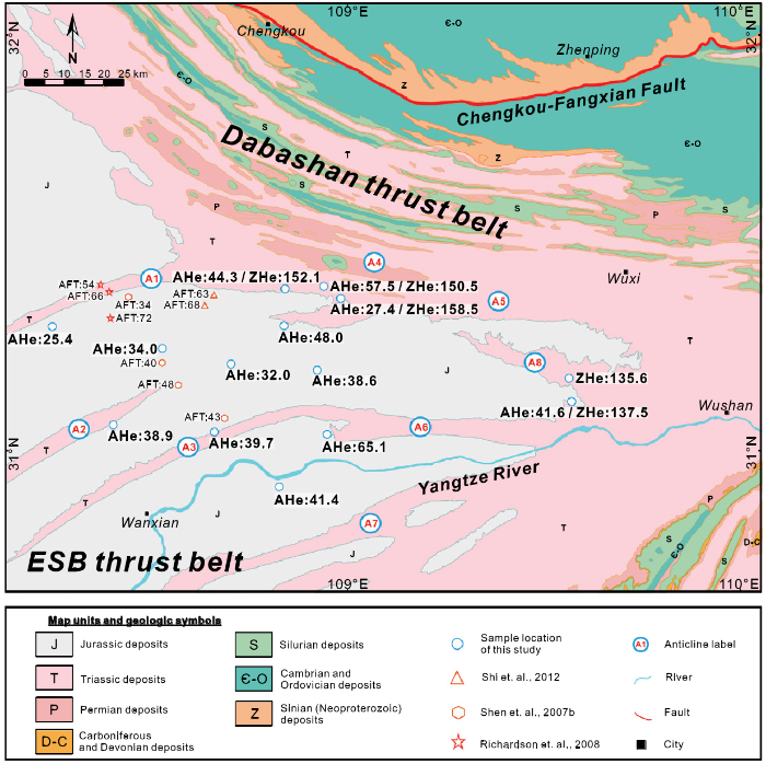 图3 川东北与大巴山褶皱冲断带交汇区(U-Th)/He定年年龄分布图