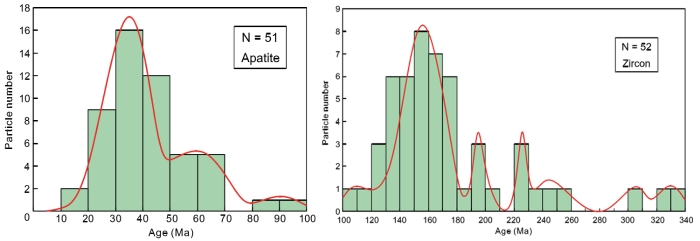 图4锆石和磷灰石(U-Th)/He定年年龄分布直方图