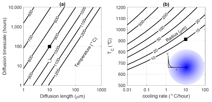 图5. (a)在恒温条件下,干的流纹质熔体中铁扩散需要的时间尺度和扩散距离之间的关系;(b)Dodson封闭温度和降温速率之间的关系