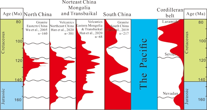 图2. 欧亚东部华北、华南、东部、蒙古及贝加尔湖畔与北美大陆西缘科迪勒拉造山带晚中生代构造-岩浆活动性对比