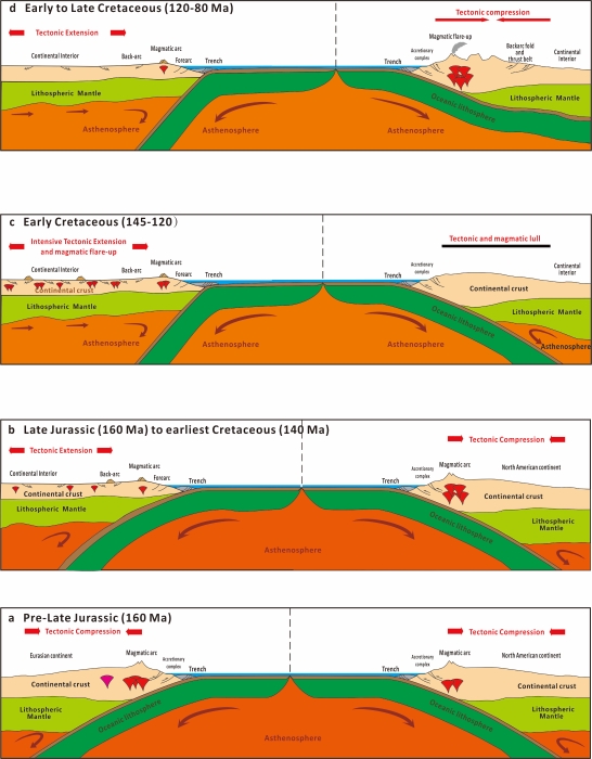2. 欧亚大陆东部受古太平洋板块俯冲影响可能追溯到晚三叠世晚期到早侏罗世,直到晚侏罗世时期一直具有安第斯型俯冲带特点。从晚侏罗世(~160 Ma)开始出现回退型俯冲(Retreating subduction),持续发育陆缘收缩与陆内伸展的分化,并于约145~120 Ma达到峰期陆内伸展,随后短暂微弱挤压反转后出现新一轮的岩石圈伸展(122-120 Ma之后)。此间,始于约180 Ma,北美大陆西缘Farallon板块的前进型俯冲(advancing subduction)形成的安第斯型俯冲带持续发展到早白垩世晚期甚至近现代。洋陆板块会聚速率、弧后挤压收缩及弧岩浆活动在约160 Ma达到峰期,与东亚地区回退相伴的晚侏罗世陆内伸展一致。与早白垩世早期(145~120 Ma)欧亚大陆东部区域岩石圈伸展相伴,北美大陆西缘出现岩浆宁静期并伴随大规模的走滑构造活动性。(图3)