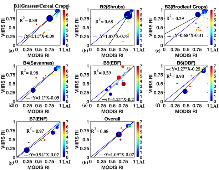 图1:各植被类型下MOD15A2H和VNP15A2H的年平均主算法反演比例RI一致性对比