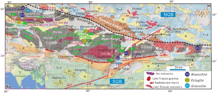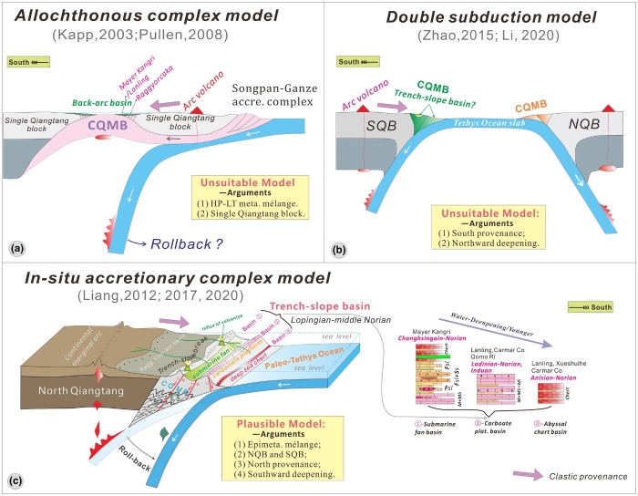 青藏高原是研究特提斯构造域地质演化和板块构造的天然实验室。E–W向展布>500 km的羌塘中央变质杂岩带(CQMB)被普遍认为是古特提斯洋俯冲形成的增生杂岩(CQAC),内部保存的二叠纪-三叠纪低温-高压变质岩和古生代蛇绿岩研究广泛,前人据此探讨了古洋盆演化时限与俯冲-增生造山过程。长期以来,羌塘中央变质杂岩带大地构造成因与构造演化存在争议,主要认识有:(1)南、北羌塘地块(SQB, NQB)之间存在原位板块碰撞带—“龙木错-双湖古特提斯缝合带”(LSSZ),变质杂岩带为古特提斯洋向北俯冲产生的增生杂岩。(2)金沙江缝合带(JSSZ)增生杂岩三叠纪发生~200 km的向南俯冲后就位于羌塘地块下地壳(南北羌塘之间不存在古特提斯洋),晚三叠世-早侏罗世被拆离断层抽拉至地表形成变质杂岩带及变质核杂岩(metamorphic core complex)。(3)古特提斯洋分别向南、北羌塘地块发生双向俯冲,两个俯冲带增生杂岩拼贴构成羌塘中央变质杂岩带。