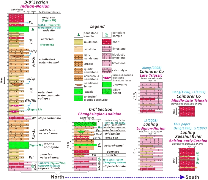 1、羌塘中央变质杂岩带二叠纪-三叠纪沉积存在时空变化,自北向南,海水总体变深,地层时代变年轻,沉积环境由半深海递变为碳酸盐岩台地和深海。北部玛依岗日、长蛇山乐平世—三叠纪沉积主要由海底扇碎屑岩、斜坡相灰岩和深海硅质岩组成。砂岩碎屑锆石最大沉积年龄(MDA)、安山岩夹层锆石U-Pb年龄与灰岩牙形石组合显示地层时代为长兴期至诺利期。南部蓝岭地区广泛分布拉丁期至诺利期台地相碳酸盐岩及安尼期-卡尼期深海放射虫硅质岩。