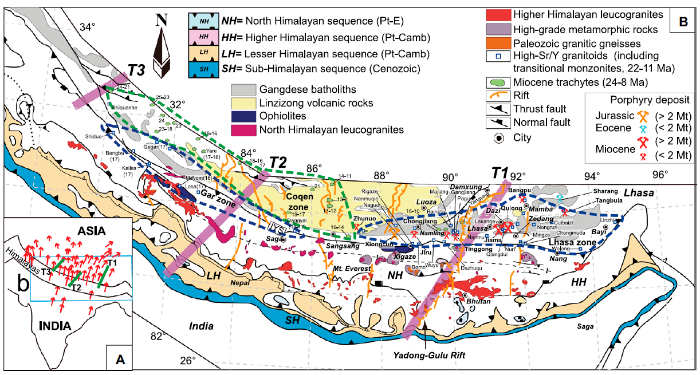 在我国青藏高原南部,地球物理学家利用面波对上地幔结构成像,并利用Pn波对上地幔顶部成像,已经在岩石圈地幔深度识别出三条显著的撕裂,其中S波异常最明显的撕裂(T1)是顺着亚东-谷露断裂带分布的(图1),该撕裂是如何影响藏南构造-岩浆-成矿格局的?针对这一重要科学问题,中国地质大学(北京)王瑞教授与朱弟成教授,联合地科院侯增谦研究员和杨志明研究员,澳大利亚莫纳什大学Roberto Weinberg教授,围绕着T1撕裂开展了系统的岩石学、矿床学和地球化学研究,取得了以下重要认识: