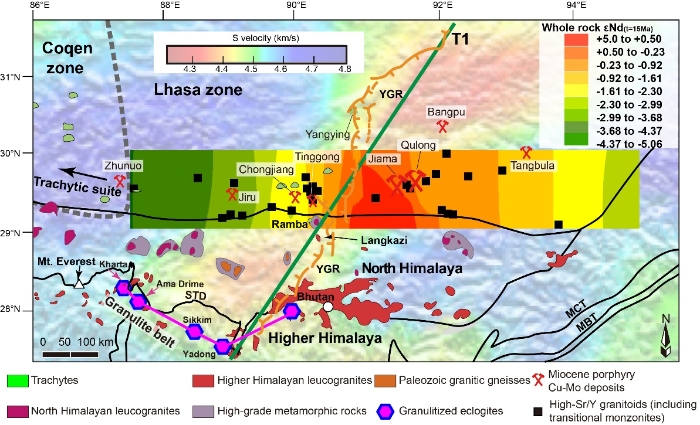 图2 T1撕裂在冈底斯-喜马拉雅造山带引发了S波异常、Nd同位素对称分布、高温麻粒岩相变质作用和强烈的壳幔相互作用。