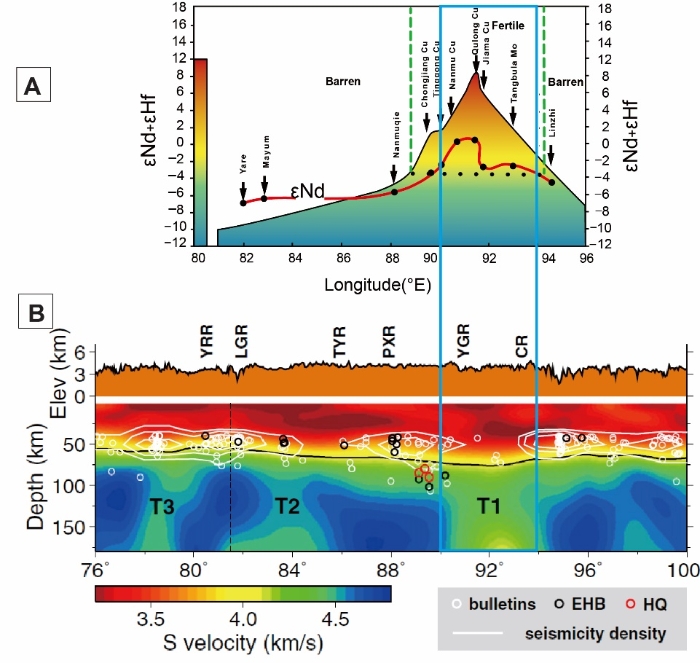 (1)在T1撕裂周边开展了精细的中新世花岗岩Nd同位素填图,显示Nd同位素值以T1为轴呈现出对称分布的特征(图2),指示了T1撕裂诱导了新生下地壳的大规模重熔,这也就合理的解释了超大型斑岩铜矿床,例如驱龙和甲玛为何都位于T1撕裂的正上方(图3)。