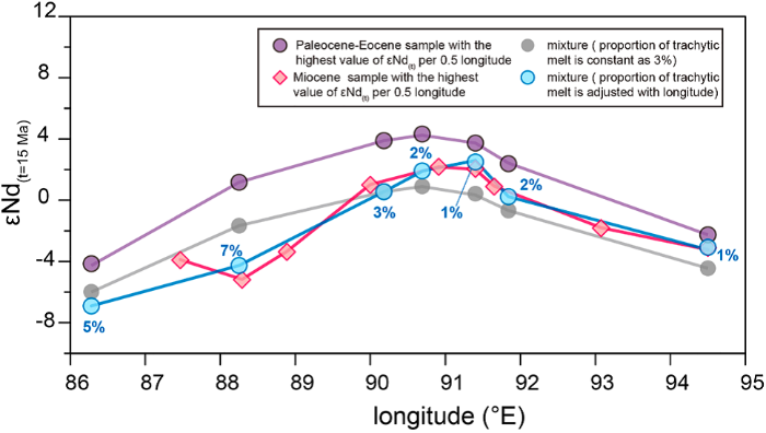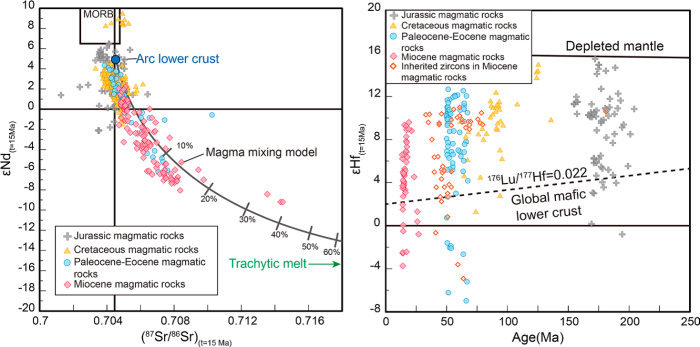 (2)冈底斯带中新世埃达克质花岗岩类具有较高的Mg# (30–70)(图4),εNd(t=15Ma)(-9.2~+2.2)与εHf(t=15Ma)(-3.7~+9.5)相对较低且变化范围较大(图2),说明岩浆中还混入了同位素更演化的基性组分,而岩石圈地幔成因的超钾质岩浆为可能的富集组分来源,模拟计算显示古-始新世岩浆与1%~7%的超钾质岩浆混合可以很好地还原出中新世岩浆的Nd同位素空间分布模式(图5)。