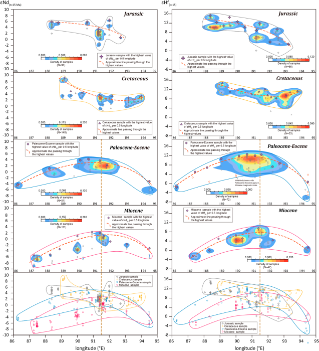 针对该问题,中国地质大学(北京)科学研究院2020级博士研究生罗晨皓,在其导师王瑞教授的指导下,与地科院侯增谦研究员、澳大利亚莫纳什大学Roberto Weinberg教授合作,整理汇总了冈底斯东段(86°E~94.5°E)侏罗纪-中新世岩浆活动的800多个全岩主微量、约430个全岩Sr-Nd同位素以及约230个锆石Lu-Hf同位素数据(图1)。通过对数据的综合分析,发现各阶段岩浆活动的Nd-Hf同位素空间分布模式具有明显的差异,在深入挖掘了这种“同位素指纹”的指示意义后,得出如下认识: