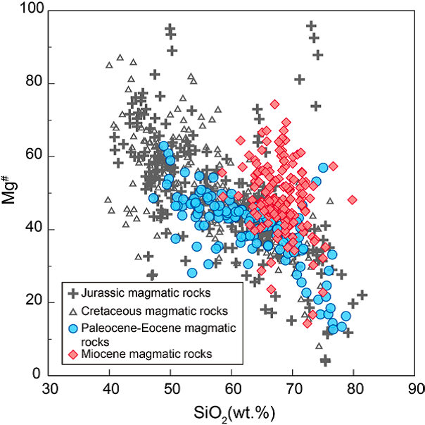 图4 冈底斯侏罗纪、白垩纪、古-始新世以及中新世岩浆Mg#-SiO2关系图