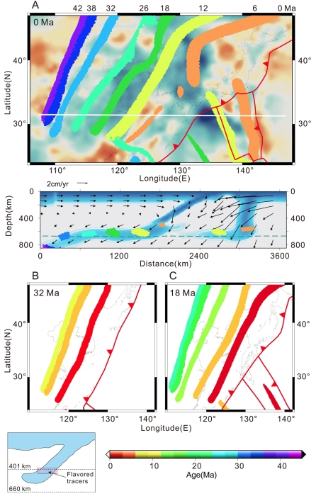 图3 预测的、俯冲于东亚陆缘深部地幔过渡带的太平洋板片的滞留年代