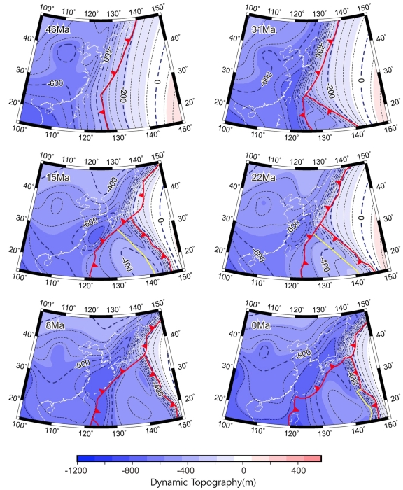 (1)新生代可变形板块构造重建结果展示了板块、板块俯冲带和板内变形演化:包括菲律宾海板块的北向运动,菲律宾海板块与欧亚板块之间的斜向汇聚,海沟三联点的向北迁移,日本海沟、南开(Nankai)和琉球海沟的向东后退,及伊豆-博宁-马里亚纳海沟向东北后退等。这一重建结果为东亚板块-地幔系统四维模拟提供了详细的运动学约束。