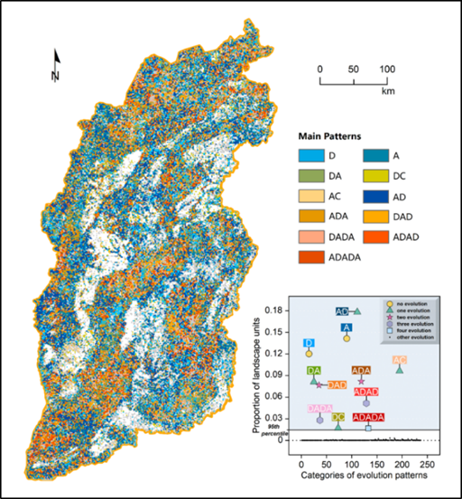 1. 在综合国内外景观格局与生态过程相互关系研究的基础上,建立了由六种重要的生态过程形成的景观格局变化类型集合,实现对景观格局变化类型全面的描述(图1);