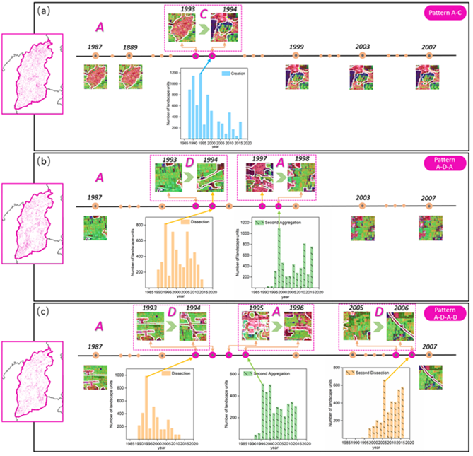 图 4. 从三种主要的演变模式中检测到的演变时间:(a)模式 A-C,(b)模式 A-D-A 和(c)模式 A-D-A-D;直方图是对各个年份经历某种演变的景观单元数量统计;与直方图连接的时间为该演变最频繁的时间