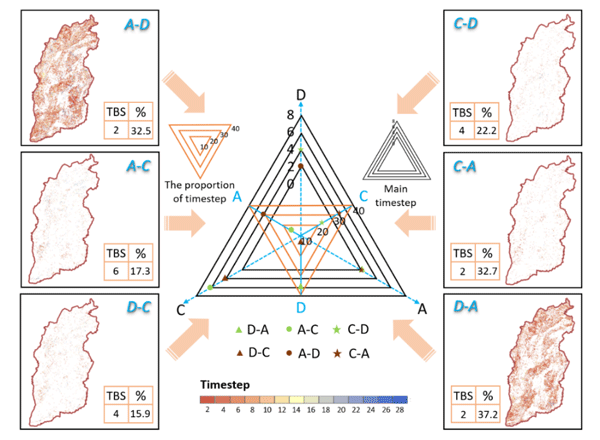 图 5. SEDM 输出的景观格局变化类型相互演变的时间步长(TBS)