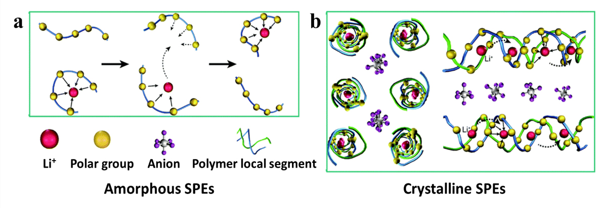 图2 锂离子在两类SPEs中的离子迁移机制示意图:a) 典型的非晶态SPEs;b) P(EO)6:LiXF6 (X = P, As, Sb)晶态SPEs