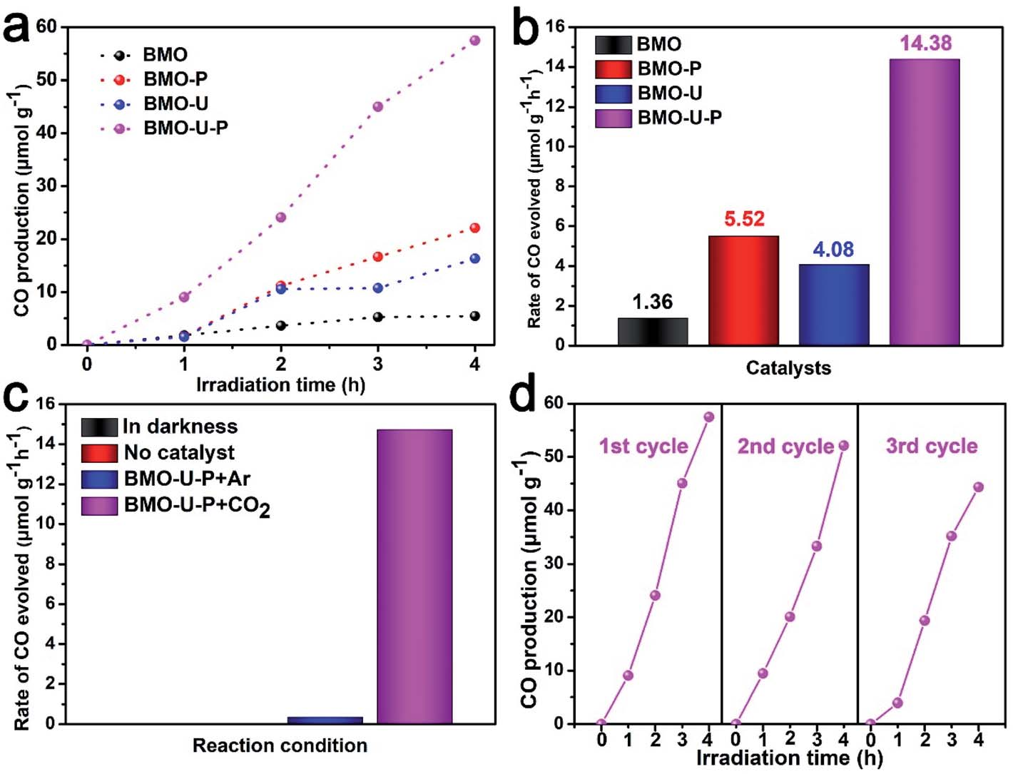 图1:(a) 模拟阳光下BMO、BMO-p、BMO-u和BMO-u-p样品的CO光催化产量图和(b) BMO、BMO-p、BMO-u和BMO-u-p样品的速率图。(c) 不同条件下或无催化剂下BMO-U-P样品的CO产率。(d) BMO-U-P样品循环实验