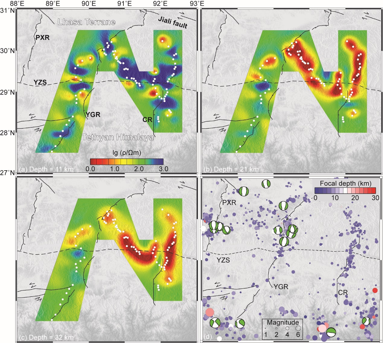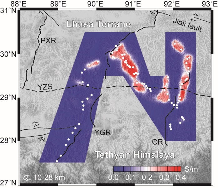 作为印度-欧亚大陆碰撞的边缘,青藏高原南部碰撞造山带地区壳幔结构与深部过程长期以来受到广泛关注。地震与大地电磁测深资料表明,区域内广泛分布壳内低速/高导层(“亮点”),并通常被认为是由流体相引起的“弱”地壳的反映;而进一步关于其诱发原因究竟是含水流体,或是局部熔融的讨论,仍存在较大争议。构建地球物理模型与高温高压实验数据间的约束关系,则可能是减少上述争议的有效途径。