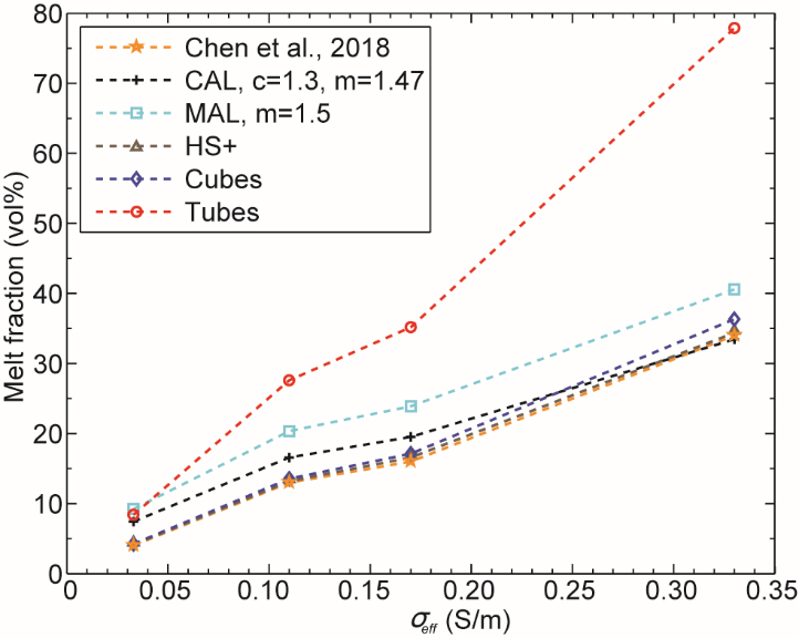 (1)拉萨地体10-28 km深度范围等效电导率达到0.3 S/m(图3),根据岩石物理实验结果,这一电导率值对应高达35 vol%的局部熔融(图4);而特提斯喜马拉雅造山带等效电导率< 0.2 S/m,对应不超过15 vol%的熔体含量。沿~ 91°E 和~ 92°E,高熔体百分比区域穿过雅江缝合带且向南延伸~ 75km。