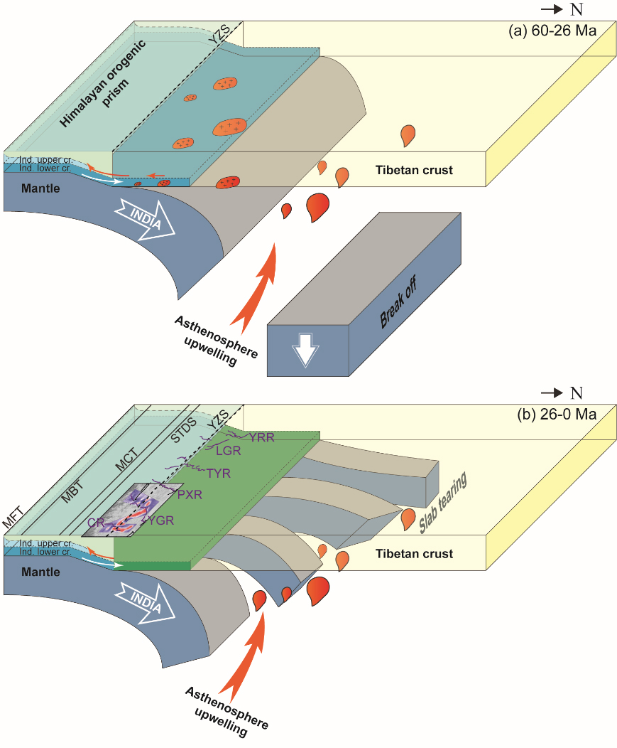 (4)推测自大陆碰撞以来,受不同构造形变环境及加热机制的影响,研究区壳内局部熔融作用大致可分为两个阶段(图5):①主碰撞(~ 65–41 Ma)与晚碰撞期(~ 40–26 Ma),局部熔融作用主要受到软流圈上涌的影响,而板块断裂及大型构造形变(如大型走滑断裂)为幔源物质提供了窗口。②后碰撞期(~ 26–0 Ma)又可进一步分为两个阶段,早期(~ 26–13 Ma)岩浆作用主要受岩石圈地幔的对流作用和/或俯冲板块的断裂或撕裂作用影响;而后(~ 13–0 Ma),中地壳局部熔融则主要为放射性生热及应变产热共同作用的结果。