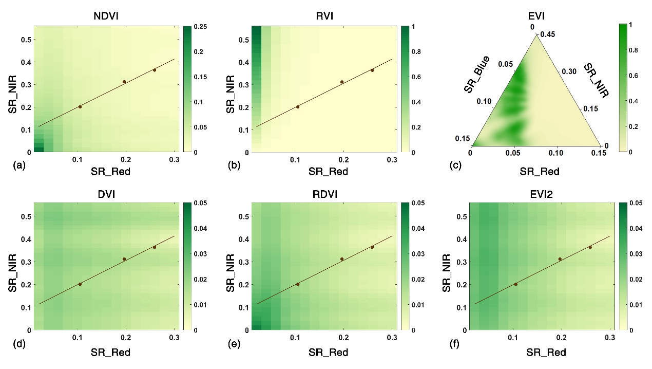 图3: 各植被指数模型在不同土壤亮度、植被丰度条件下反演FVC的不确定性