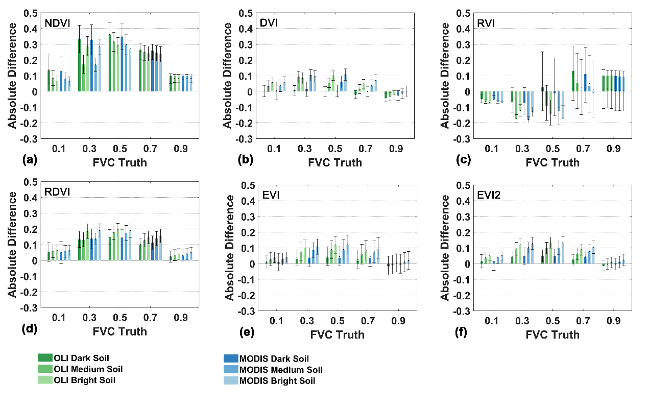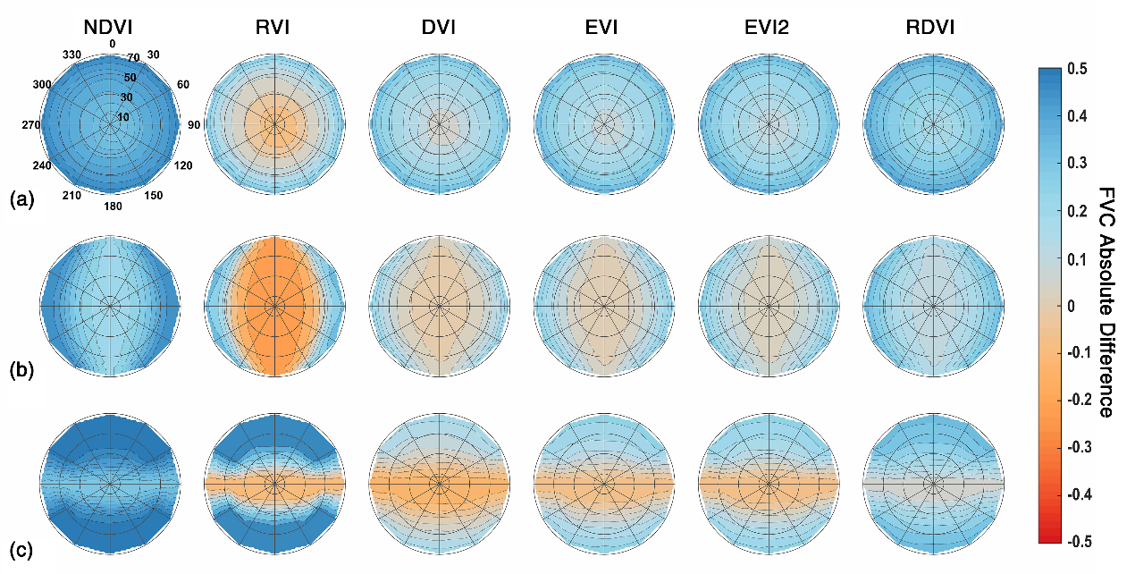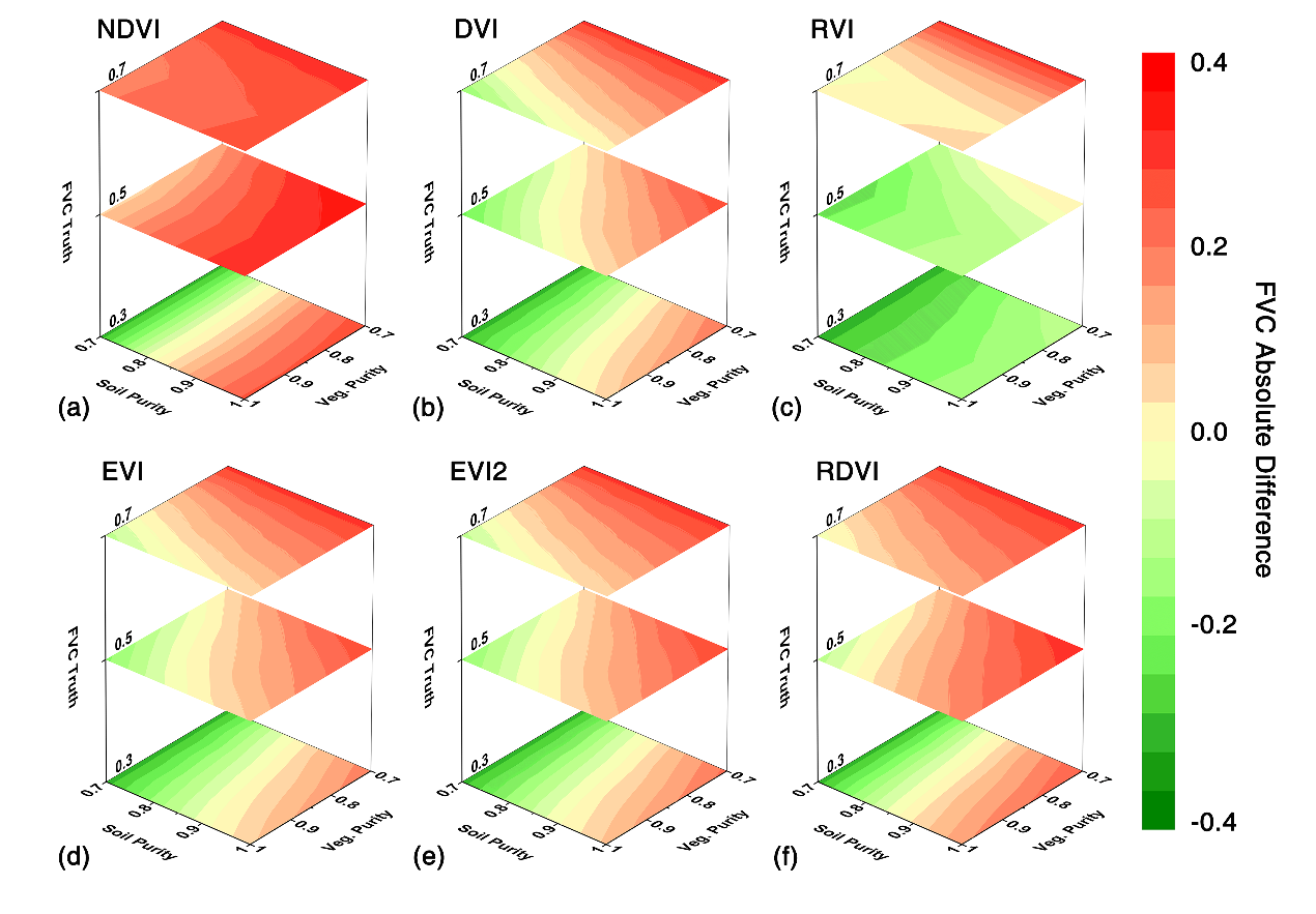 2、 在对三维场景模拟的分析中,研究发现基于DVI、EVI和EVI2的模型在反演FVC时表现更好,且FVC的反演值随土壤亮度的增加而增加;基于NDVI和RDVI的模型均高估了FVC;基于RVI的模型,FVC的反演值随土壤亮度的增加而减小,且当引入输入误差后对反射率不确定性最敏感。