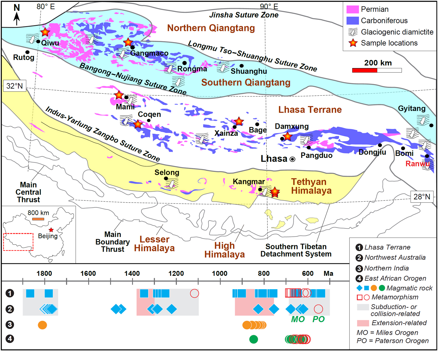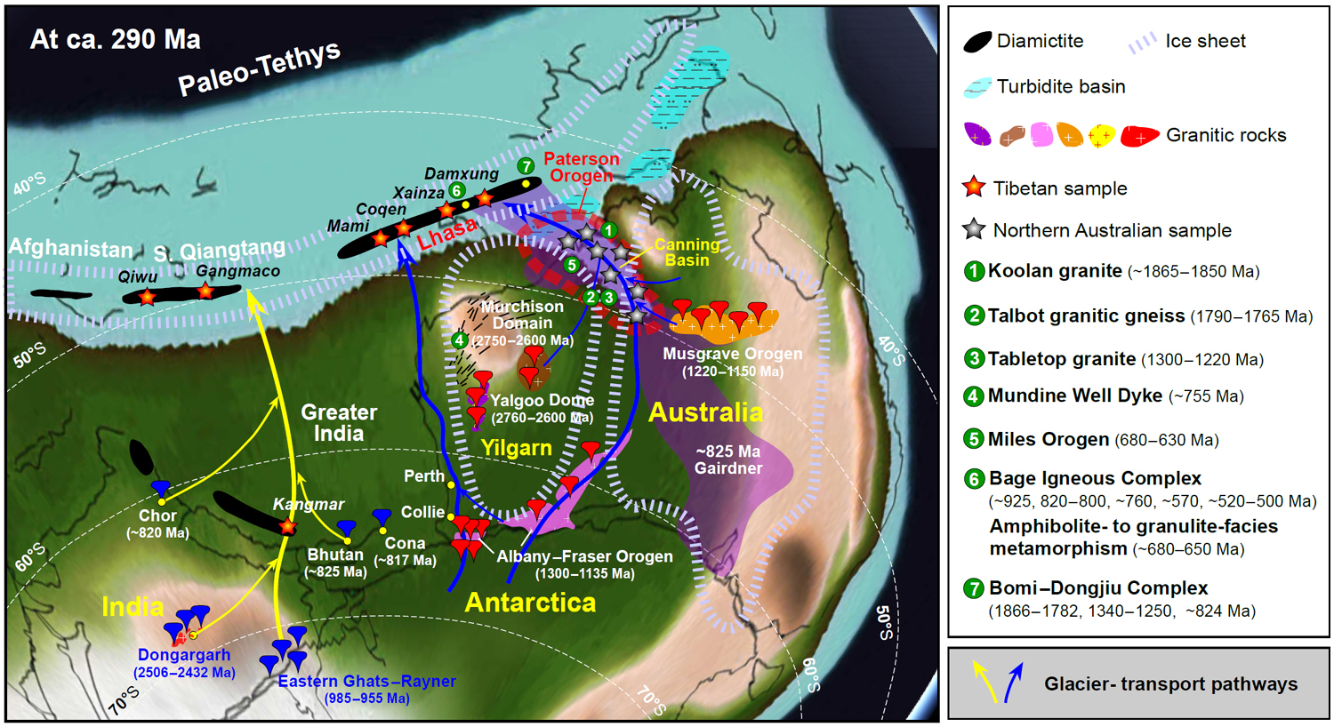 由冰川消融形成的冰海相杂砾岩,由成分复杂的砾石和沙泥质基质两部分组成。砾石常呈杂乱无序地分布在泥沙质基质中(粉砂岩和板岩),常见穿层的坠石结构,多呈次圆-次棱角状,无分选或分选程度极低。印度大陆和澳大利亚大陆的石炭-二叠纪冰海相杂砾岩,是重建相关地体来源于冈瓦纳大陆的诊断性指标。例如,羌塘和拉萨地体上的石炭-二叠纪冰海相杂砾岩就广泛被作为这些地体裂离自印度大陆的地质证据。然而,这些冰海相杂砾岩常常显示类似的地层关系和岩相学成分,使得很难判断其物源区在石炭-二叠纪时期究竟是同样位于特提斯大洋南部的印度大陆还是澳大利亚大陆。