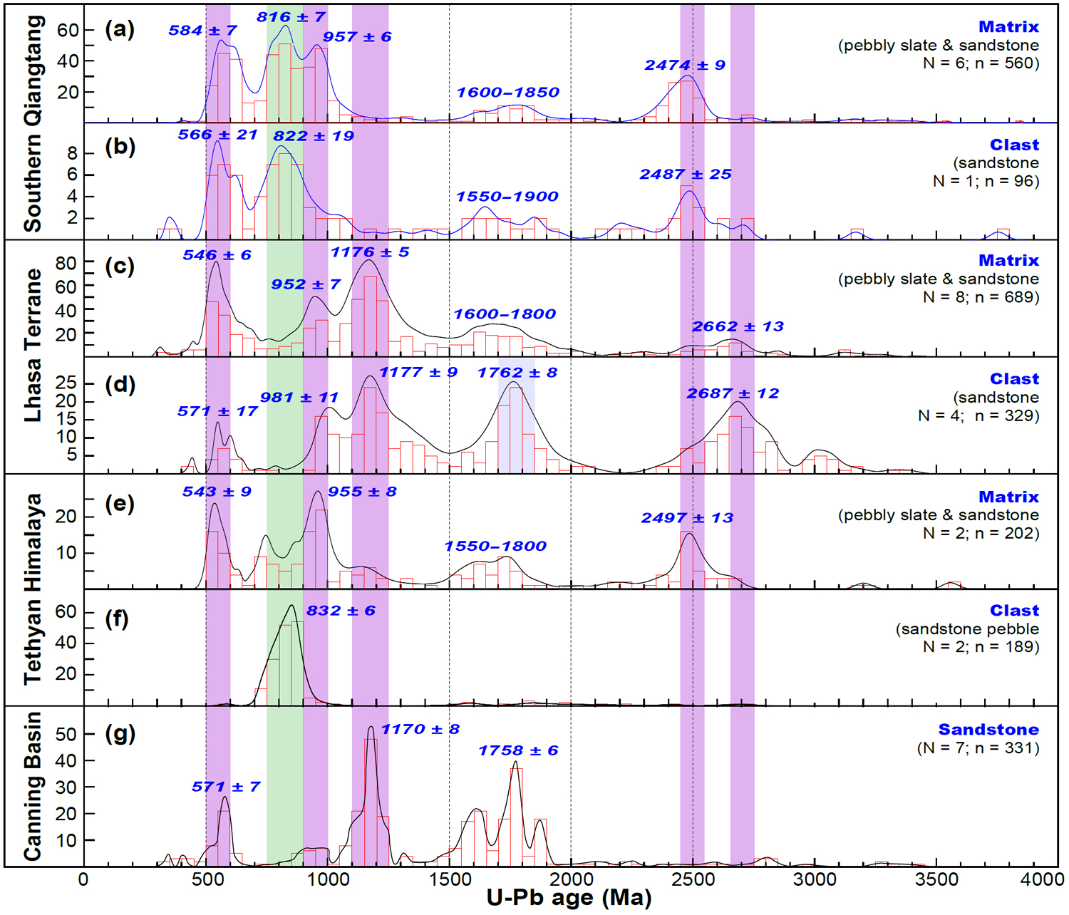 图3 青藏高原石炭-二叠纪冰海相杂砾岩和澳大利亚北部Canning盆地碎屑锆石年龄频谱
