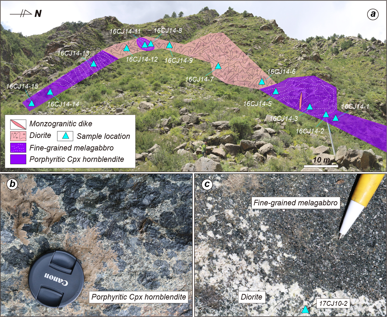 针对上述科学问题,中国地质大学(北京)“大陆汇聚与青藏高原生长”求真研究群体博士研究生许伟,在导师朱弟成教授和澳大利亚莫纳什大学Roberto F. Weinberg教授的共同指导下,对冈底斯岩基东段崔久火成杂岩中的富角闪石超镁铁质-镁铁质捕虏体开展了野外、岩石学、锆石U–Pb定年、矿物和全岩地球化学等方面的工作,取得如下一系列研究成果。