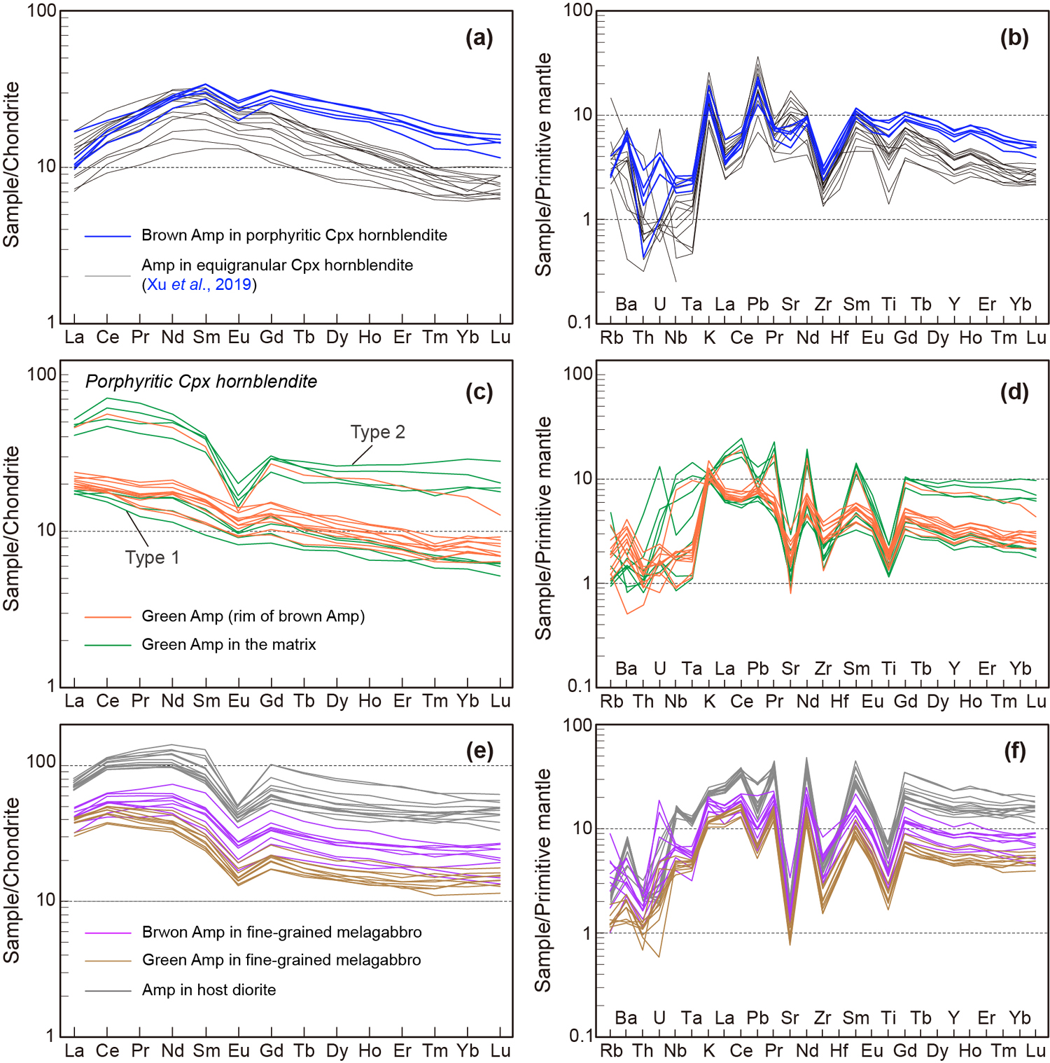 (2)岩相学观察和全岩及矿物地球化学数据指示斑状辉石角闪石岩和细粒角闪辉长岩均由互不平衡的两组矿物组合组成:(a)角闪石斑晶的棕色核+其内的单斜辉石包裹体;(b)角闪石斑晶的绿色边+绿色基质角闪石+基质单斜辉石+斜长石+石英+副矿物。第一组矿物组合内的棕色角闪石和单斜辉石均富集中稀土(MREE)、亏损轻稀土(LREE)和重稀土(HREE),并轻微亏损Ti(图2和3),而第二组矿物组合内的绿色角闪石和单斜辉石以富集LREE、亏损MREE和HREE为特征,并强烈亏损Sr和Ti(图2和3)。