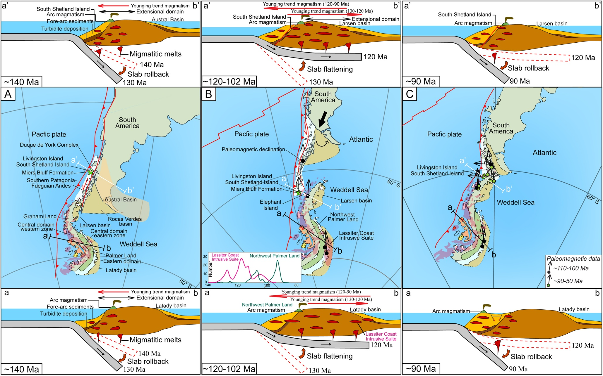 南极半岛位于南极的最北端,靠近南美板块,其形成过程及构造属性仍存在一定争议。Suárez(1976)曾提出南极半岛是发育在冈瓦纳大陆边缘,在古太平洋板块俯冲下形成的以中-新生代岩浆弧为主的地体,发育了完整的沟-弧-盆体系。但是Vaughan and Storey(2000)等在南极半岛南部识别出大规模脆性-脆韧性东帕默地剪切带后,将南极半岛划分为西部、中部与东部构造域,提出西部构造域可能是古太平洋板块向中部构造域俯冲过程中发育在中部构造域西侧的弧前增生楔或者外来地体。古地磁学能够半定量限制板块的古地理位置与运动过程,是解决南极半岛的构造属性与形成过程的有效手段。