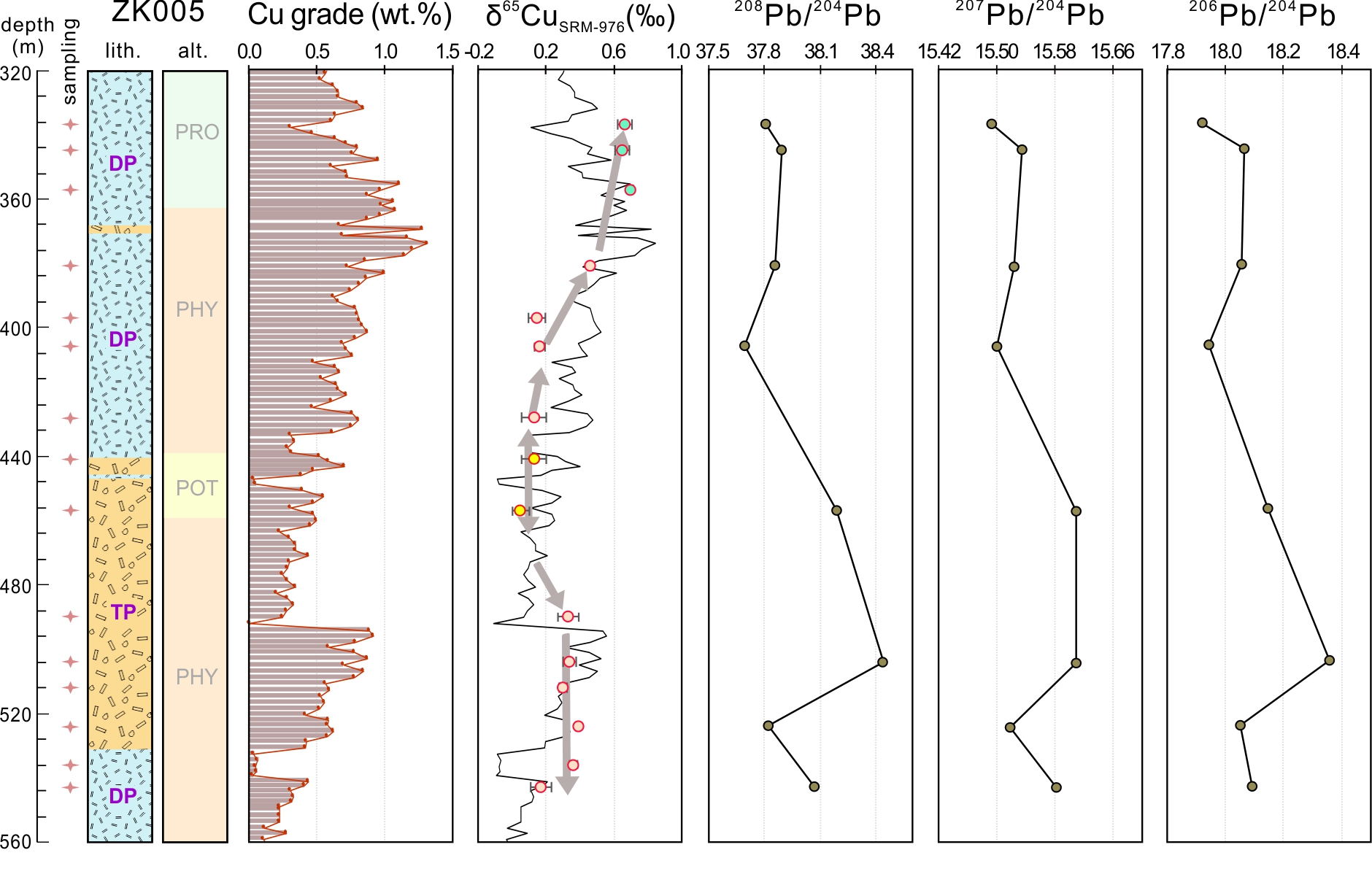 4、土屋铜矿床蚀变分带特征、铜品位及铜同位素组成变化显示(图5),钾化蚀变带具有较低Cu含量和较轻Cu同位素组成(δ65Cu = 0.05 – 0.13 ‰);与之相反,绢云岩化蚀变带具有较高Cu含量和较重Cu同位素组成(δ65Cu = 0.13 – 0.46 ‰)。蚀变分带与铜同位素变化特点为中亚造山带斑岩成矿系统的找矿勘探提供了新思路。