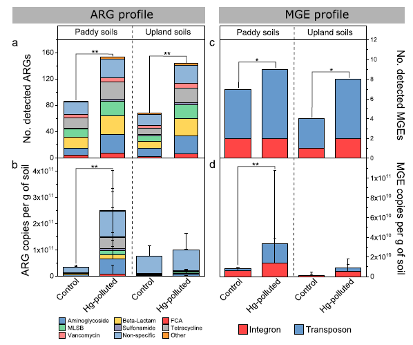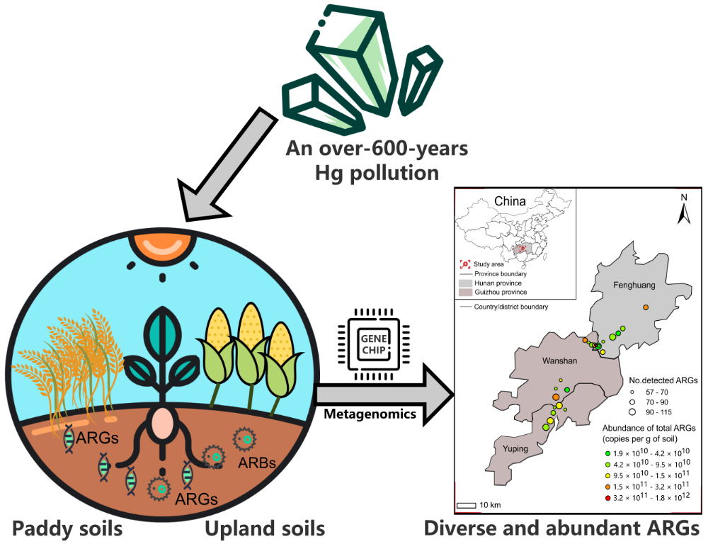 农业土壤是抗生素抗性基因(Antibiotic Resistance Genes, ARGs)的重要储存库。农业土壤通过作物种植和食物链途径与人类健康紧密联接,因此研究农业土壤抗生素抗性组对人类健康非常重要。环境中的重金属污染会对环境微生物释放选择压力,可能通过共选择作用使环境中抗生素抗性基因富集,从而加剧耐药性的传播扩散,危害公众健康。然而,环境的汞污染对农业土壤抗抗生素抗性组的影响仍然未知。