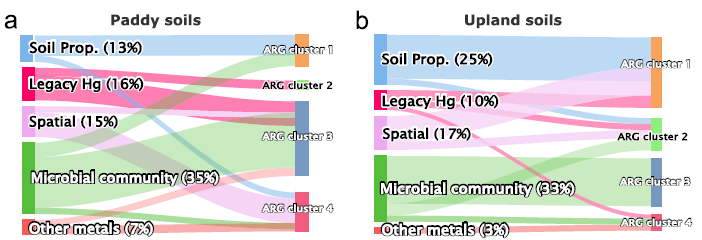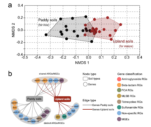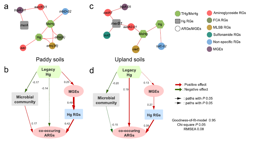 图5 汞污染不同种植方式(水稻土和旱地土)的农业土壤抗生素抗性组的影响(a)网络分析揭示汞、汞抗性基因、可移动遗传元件、抗生素抗性基因的共现规律;(b)路径分析揭示汞对共现抗生素抗性基因的影响途径。