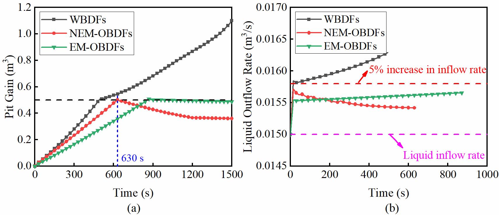 1) 与平衡气侵模拟器相比,非平衡气侵模型中存在一个独特的气体溶解阶段。在这一阶段,池液面增量大幅度降低,这种现象可能会被钻井工程师误解为井漏或气侵强度降低(图1)。