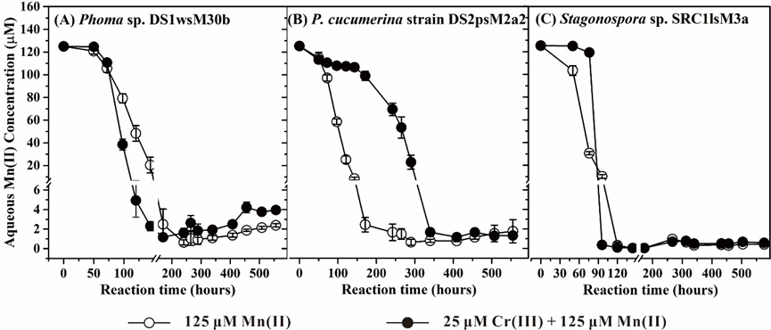 针对上述科学问题,我校水资源与环境学院刘晓磊博士后在董海良教授指导下,考虑到子囊真菌具有不同类型的锰氧化机制,选取了三种不同的子囊真菌,探究锰氧化真菌耦合Mn(II)与Cr(III)氧化反应的动力学过程及机理。通过系统的研究分析,取得如下创新性成果: