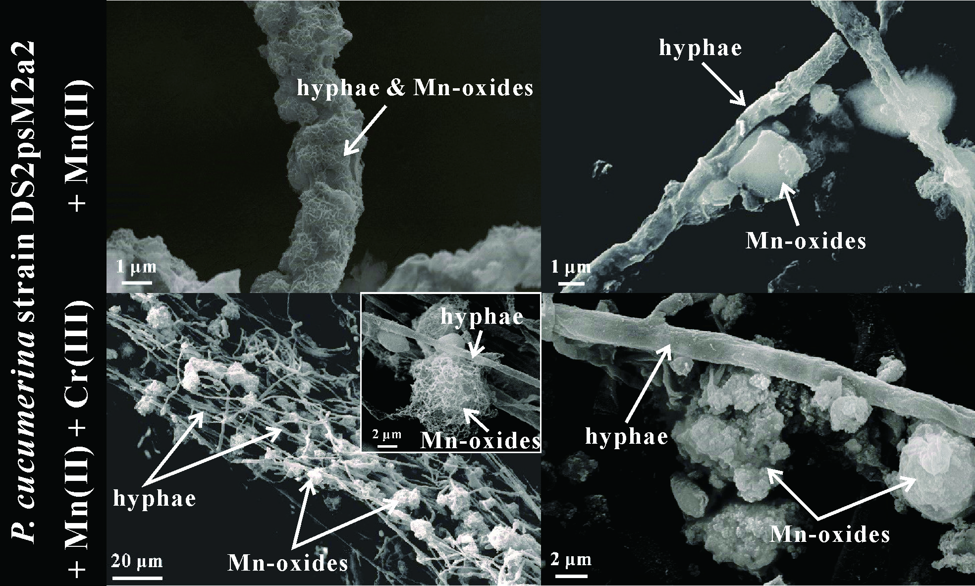 (3)真菌生成的锰氧化物的形貌及其与菌丝的空间分布关系,与真菌的种类及Cr(III)的存在密切相关(图3)。