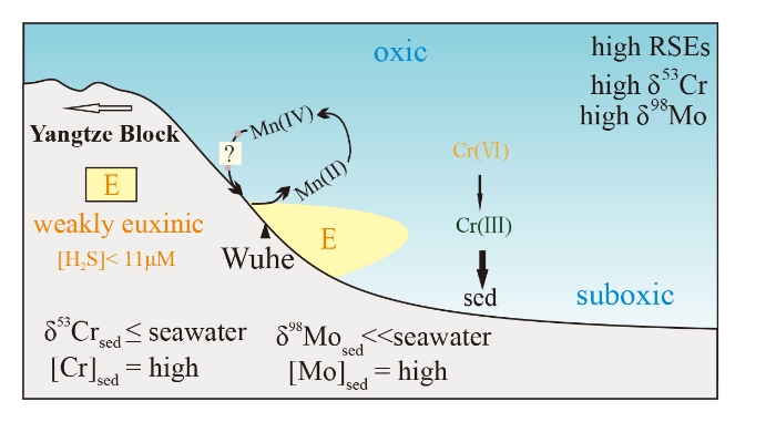 (1)五河剖面埃迪卡拉纪-早寒武世δ53Cr的背景值较低,接近地壳平均值(-0.124 ± 0.101‰),且自生Cr含量呈弱富集或亏损状态(图1和2),表明当时海洋大部分时期以缺氧为主,导致海水溶解Cr(VI)库减小。