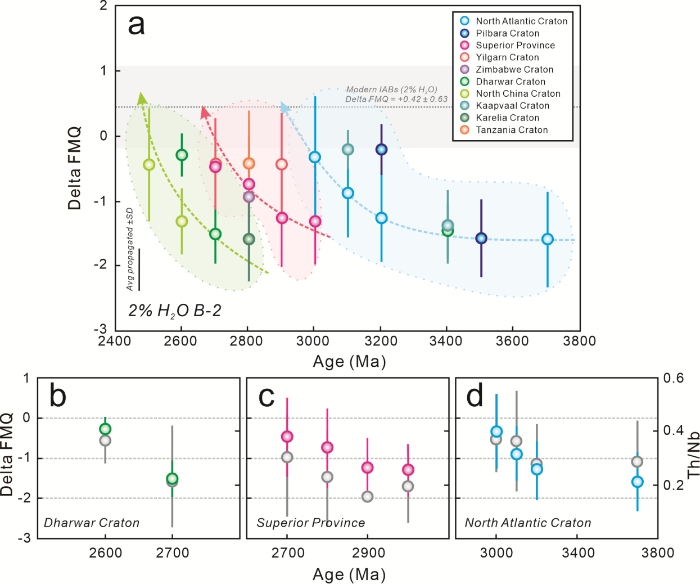 图1 太古宙B-1系列玄武岩样品的氧逸度及Th/Nb比值示意图