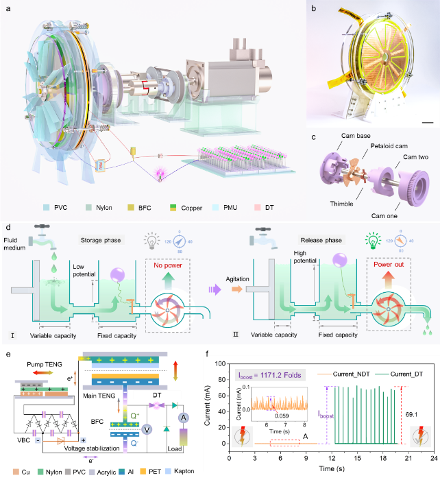 步入5G和万物互联的物联网时代,各种分布式传感器、可穿戴电子设备愈加普及,长期稳定的电能供给成为产业发展面临的关键技术挑战。作为一种新兴低频机械能量高效收集技术,摩擦纳米发电机(TENG)被认为是一种环境友好、极具潜力的低功率分布式能源需求的解决方案。但早期的TENG技术受制于摩擦介电材料的表面电荷密度较低,静电感应电流有限,输出性能有待提高等。为了提高表面电荷密度,传统方法集中在材料种类选择、介电薄膜表面改性、发电结构优化以及工作环境控制等方面,但其对电能输出的提升有限。最近兴起的电荷泵技术有望突破其瓶颈,进一步提高其输出性能,然而大多数的电荷泵技术都采用同模式的泵、主TENG,同时两者间为同步耦合运动关系,这一方面降低电荷的产生、存储与转移效率,另一方面介电材料间持续性地接触摩擦,增加磨损缩短使用寿命。因此,探索新的电荷密度增强机制与方法具有重要的科学研究意义和应用价值。