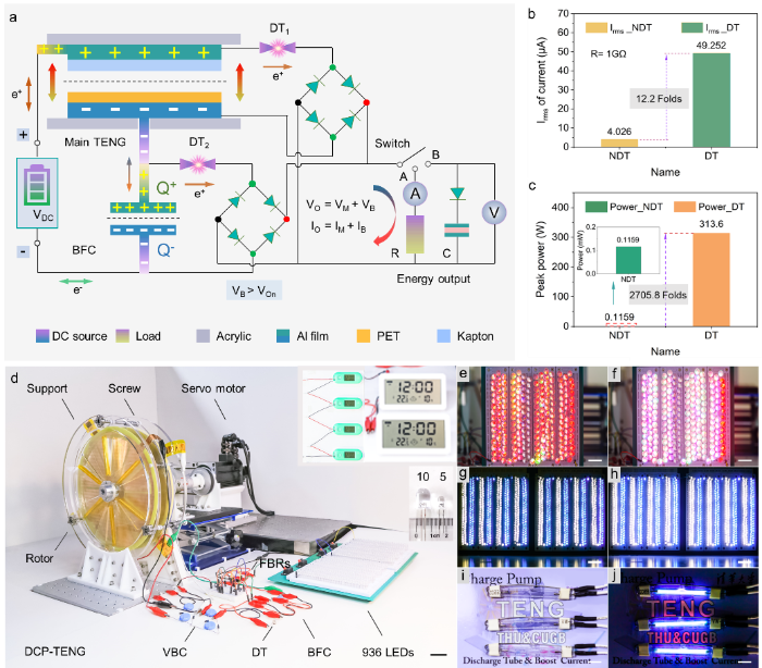 3. 利用放电管的放电开关效应,能够实现千倍地提升TENG的瞬时输出电流和功率,同时计算得到的平均输出功率密度为21.25 W/m2且电荷密度为628.7μC m-2;输出电能可在低频运动(转速为100 rpm)条件下持续供能211个大LED灯或936 个小LED灯、电子表、温湿度传感、荧光灯管等低功率电子元器件(图3)。