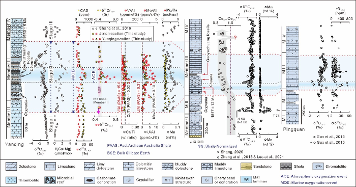 针对上述科学问题,我校科学研究院、“深时生命与环境演化”求真研究群体博士研究生谢宝增在导师汤冬杰副教授指导下,与我校“金属同位素与壳幔物质循环”群体朱建明教授,“深时生命与环境演化”求真群体徐东滔博士生、史晓颖教授合作,并在中国科学院地质与地球物理研究所王相力、周锡强副研究员以及国家地质实验测试中心周利敏副研究员的帮助下,对北京延庆和天津蓟县剖面~1.57 Ga高于庄组开展了系统的Cr、S同位素研究工作,并取得了以下创新性认识: