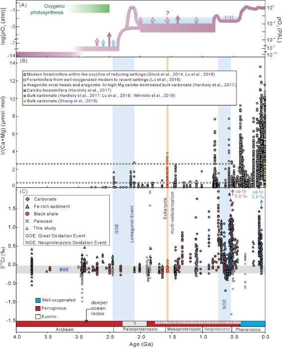 图2 地质历史时期大气氧浓度的演变过程(A)、浅海氧化还原指标I/(Ca+Mg)变化趋势(B)和大气氧化还原指标δ53Cr的长期变化序列(C)